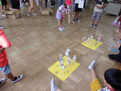 6月30日 みさきフェスティバルがありました。開会式のあと、たてわり班に分かれ各学級のコーナーで活動しました。1年はボーリング、2年はわなげ、3年はコイン落としをしていました。