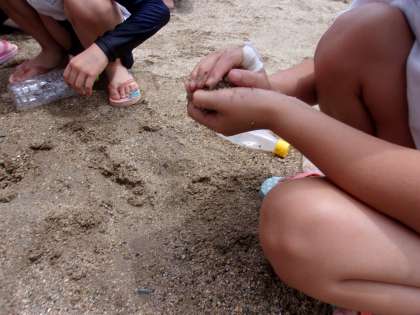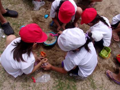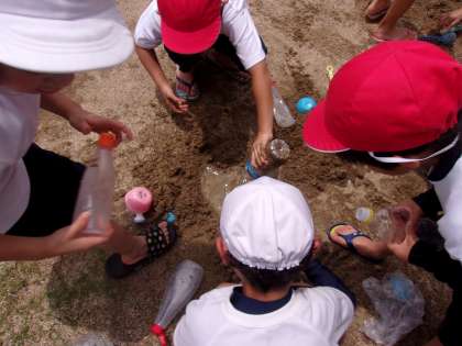 7月14日 生活科でどろあそびをしました。砂場で、砂と水を使って活動しました。思い思いの形を作ったりして活動しました。