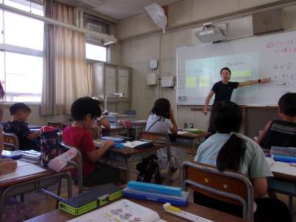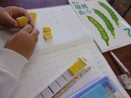 10月2日 算数で、かけ算について学習していきます。4つのかたまりが2つあるということをブロックを使って表しました。