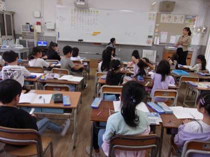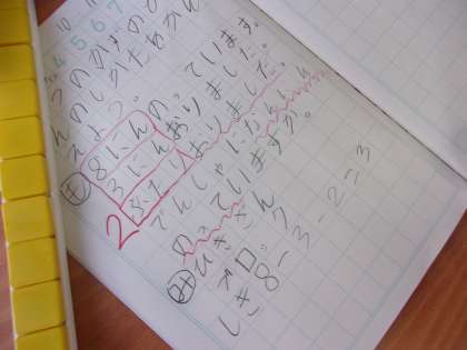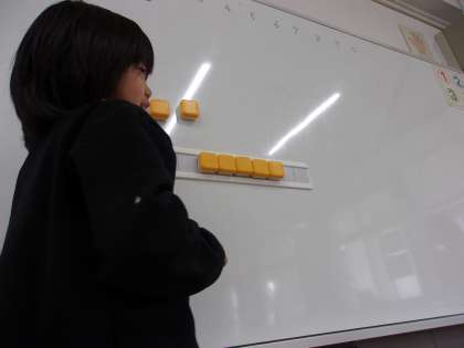 10月11日 算数で3つの数字が出てくる引き算を学習しました。8人乗っている乗り物からまず3人おり、次に2人おりると何人になるかという場面の問題を考えました。こどもがブロックを使い、みんなに説明しました。