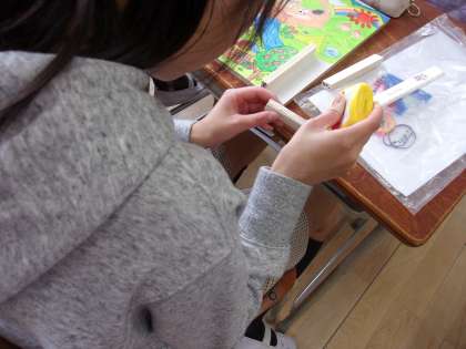 10月30日 図工でくぎうちゲームを作りました。スマートボールのようなものです。盤面に絵を描き、ボールを打つ部分を木工ボンドではりました。