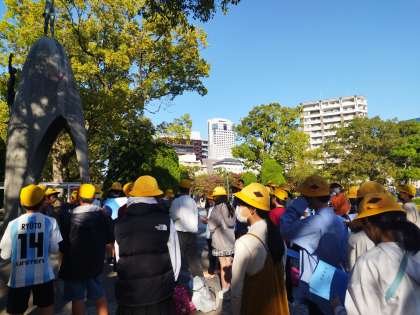 平和公園内の慰霊の塔に、全校児童がつくった千羽鶴をささげ、平和の誓いをしました。