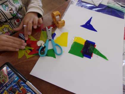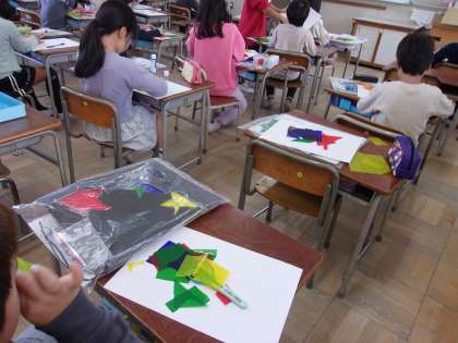 11月28日 図工でカラーのセロファンを使い作品をつくります。色の違うセロファンを重ねて、違う色を作る工夫をしました。