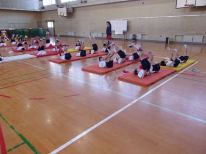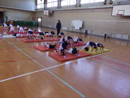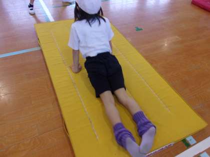 12月6日 体育でマット運動をしています。上半身を支える動きや体幹の強さを高める動きを練習しました。