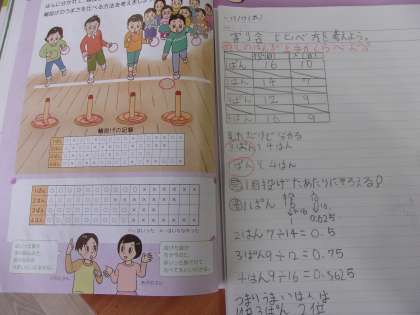 12月7日 算数で割合について学習しています。輪投げで投げる数がちがう人の入った割合を比べるということについて考えました。