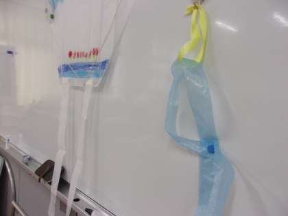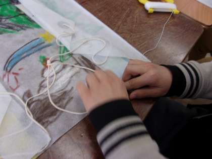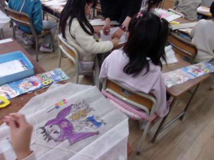 1月18日 生活科でたこあげをします。そのためのたこづくりに取り組んでいます。ひもを結ぶところでは、ホワイトボードにはった見本を見ながら行いました。