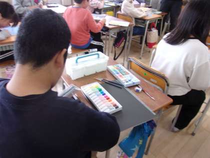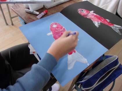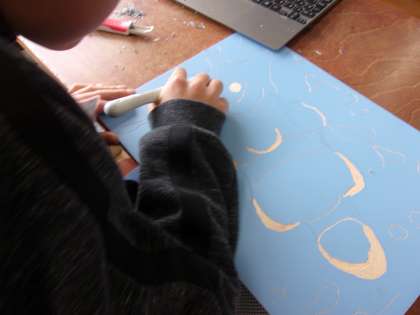 1月22日 一般多色刷り版画に取り組んでいます。けがに注意しながら版を彫り、色をつけました。