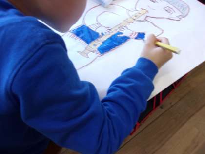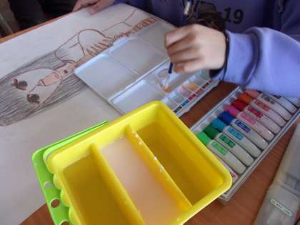 1月29日 図工で、リコーダーをふく自分の絵を描いています。今日は、絵の具の混ぜ方を教えてもらい肌色を作りました。どんな作品ができるのか楽しみです。