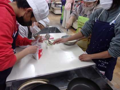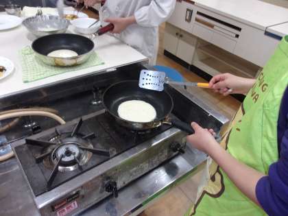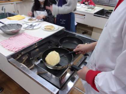 2月29日 家庭科でホットケーキを作りました。メイプルシロップとチョコレートで味付けしました。てぎわよく作りおいしくいただきました。