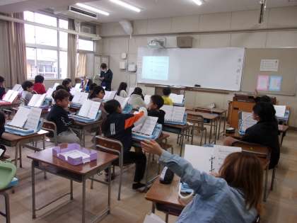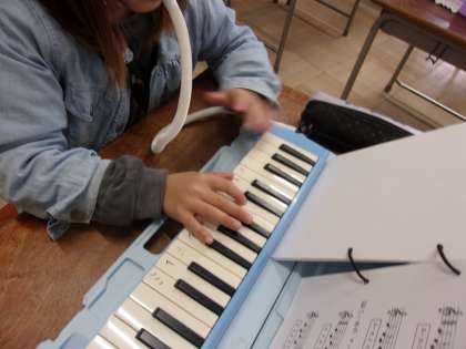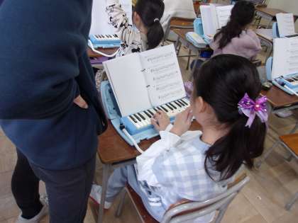 3月6日 音楽で、これまで習った曲をけんばんハーモニカで演奏しました。先生が一人ひとりのようすを見ました。