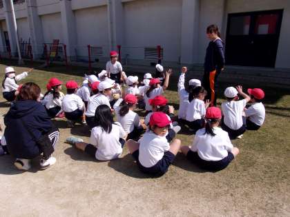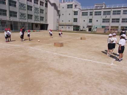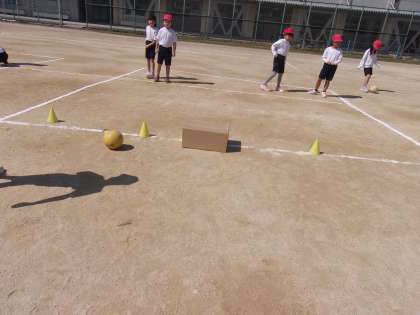 3月11日 体育で、ボールをける練習をしています。的になるダンボールにあてることができるように、けりました。