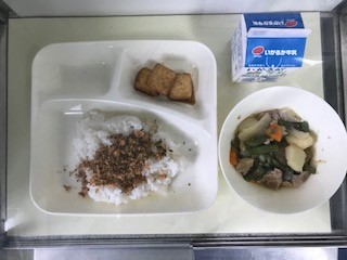 鶏肉とじゃがいもの煮もの、あつあげのしょうゆだれかけ、紅ざけそぼろです。