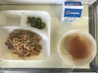 焼きそば、きゅうりのしょうがづけ、ソフト黒豆です。 焼きそばの献立は、人気があります。