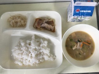 焼きとり、みそ汁、もやしのゆずの香あえです。