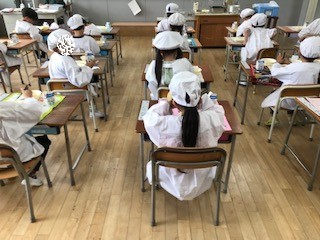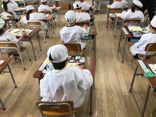 1年生の教室です。 静かに給食を食べていました。 今日の焼きとりは、おいしかったです。