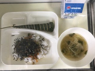 きんぴらちらし、すまし汁、ちまきです。 こどもの日の行事献立です。