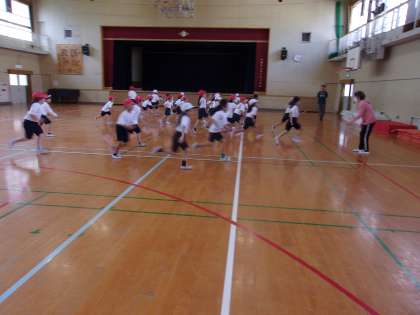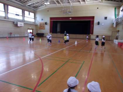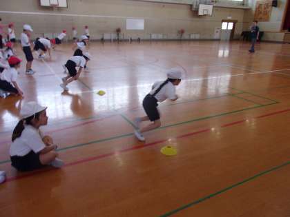 5月29日 体育でいろいろな動きを取り入れて走りました。座ったり寝転んだりした状態から立ち上がって走ったり、フラフープの中に2人で入って走ったりしました。