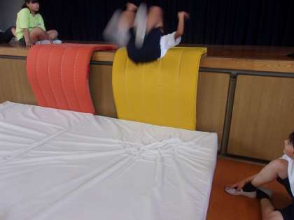 6月3日 体育で、台上前転と頭はねとびに取り組んでいます。講堂舞台にマットを敷いて着地の感覚を体感しました。
