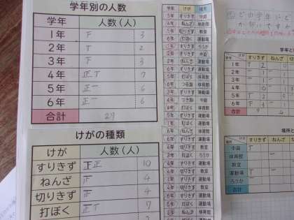 6月4日 算数で、データを表やグラフに表すという学習をしています。保健室来室で、どのような理由で来たのか何年生が来たのかのデータを表に整理してグラフに表します。