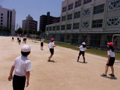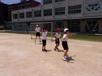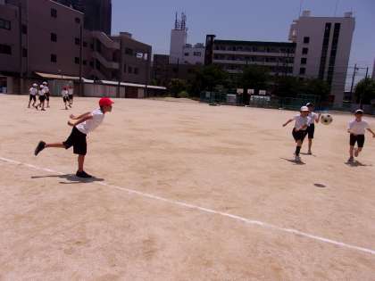 6月12日 体育でサッカーを学習しています。一人ひとりがボールにふれる機会を確保するため、まずは3人対3人ぐらいの人数でミニゲームをしました。