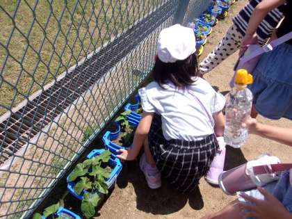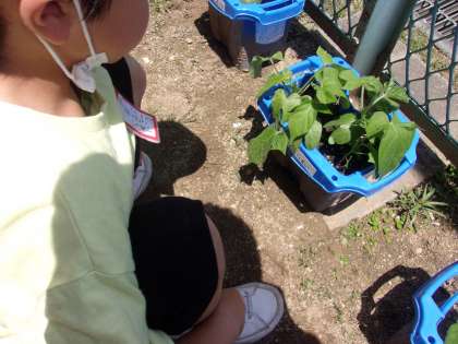 6月12日 生活科であさがおを育てています。水やりと観察をしました。