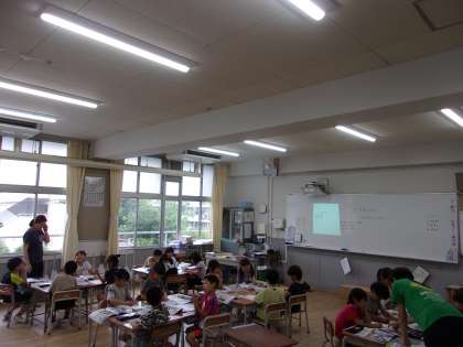 7月11日 生活科で水遊びをします。今日は、めあてを確認して、どんなことができるのか話を聞きました。