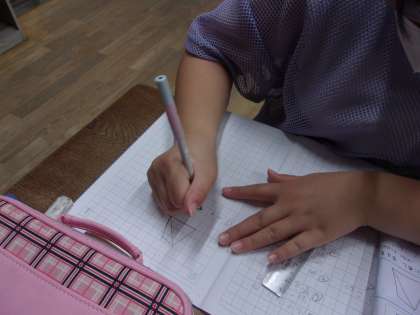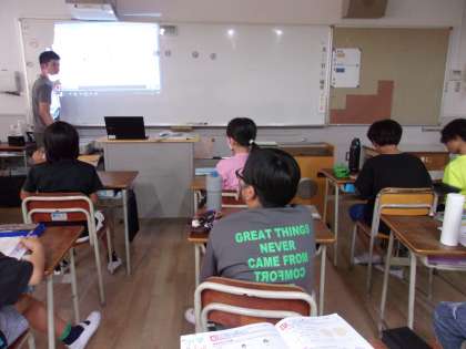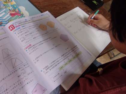 7月12日 算数で多角形の角の和について学習しています。五角形は、三つの三角形からできており、180度×3で角度が求められることを学びました。