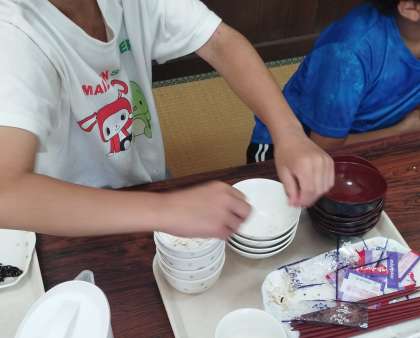 片づけは、食器やおわんを重ね炊事場まで自分たちで持っていきました。