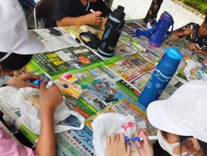 川遊びのときに手に入れた石に林間学習の思い出を描きました。