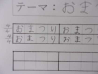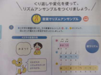 8月29日 音楽で、拍の長さとリズムについて学習しました。4分の4拍子を理解するために、4マスに言葉を書いて、それを歌ってリズムを確かめました。