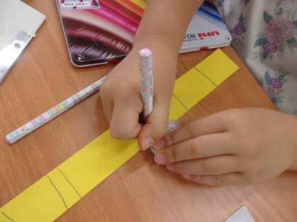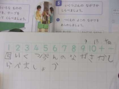 9月18日 長さをどうやってはかるのかについて学習していきます。親指と人差し指を広げた長さのいくつ分という方法やテープを使った方法を試しました。