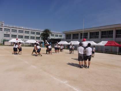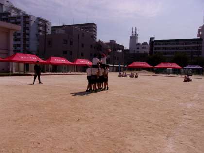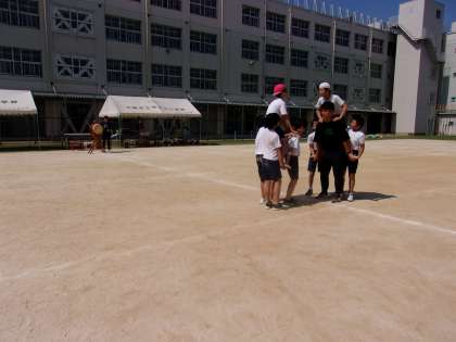 10月1日 騎馬戦を運動場で練習しました。上に乗る人が安定するように協力して騎馬を組み、競技にのぞみました。