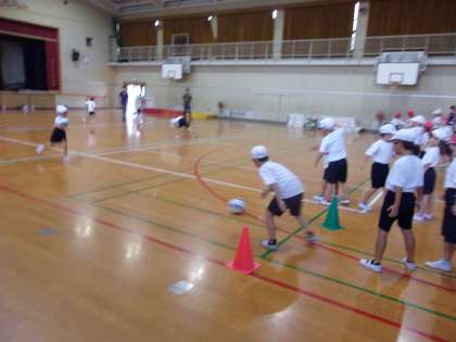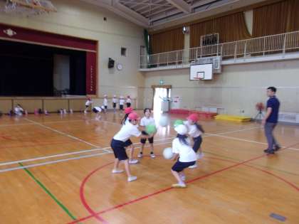 10月28日 体育でボールを使って様々な動きをしました。リレーの形式で転がしたボールを追いかけたり、グループで輪になり同時に隣の人に投げて受けたりしました。