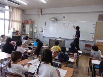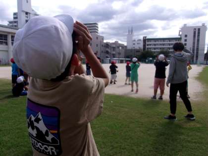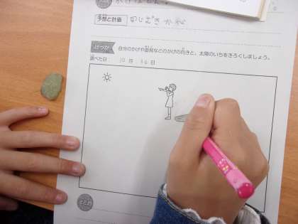 10月30日 理科で太陽とかげについて学習します。今日は、太陽と人のかげの位置について確かめました。遮光板を使って太陽を見て、そのあとかげをさがしました。