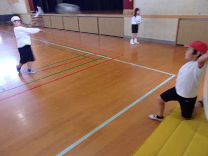 12月4日 体育でボールを投げる動きをしました。2人組でキャッチボールをした後、コントロールをつけるためにフラフープの中を通せるようにボールを投げました。