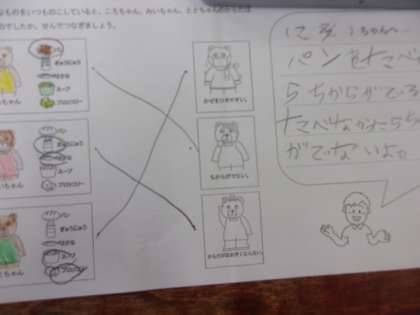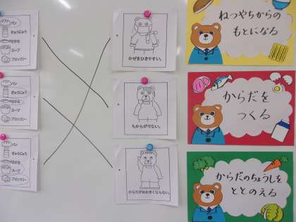 12月4日 本校食育の先生による授業が行われました。食べ物には、体をつくるものや、調子を整えるものなど、種類によって役割があることを学びました。