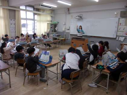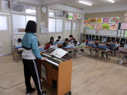 1月15日 音楽でけんばんハーモニカの指の使い方について学習しました。それぞれの指に番号をつけ音の高さによって指をかえて演奏することを習いました。