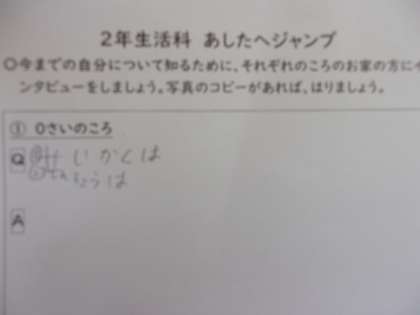 1月20日 生活科で自分の生い立ちをふりかえります。家の人に、小さい時の自分の様子について聞くための質問を考えました。