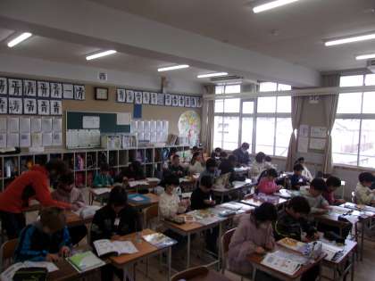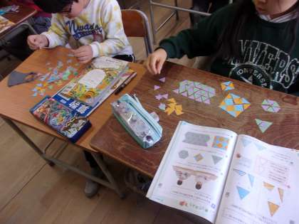 2月5日 算数で図形の学習をします。三角形を並べていろいろな形を作るという学習をしました。
