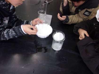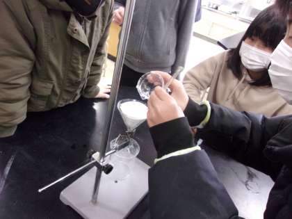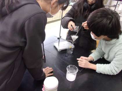 2月5日 理科で、水溶液から溶かしたものを取り出すという学習をしました。水溶液をろ過した後、さらに冷やしてみました。