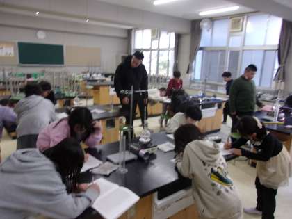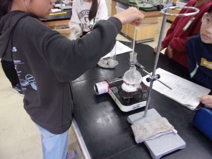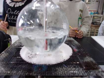 2月10日 理科で水をあたためるとどうなるか実験しました。水中から泡が出てきて、フラスコの口から湯気が出てきました。温度の上がり方についてグラフを作りました。