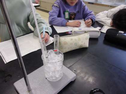 2月25日 水を冷やすとどうなるかの実験をしました。試験管に入れた水の高さが凍ってくると少し高くなりました。凍ると水の体積は大きくなるようです。