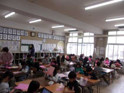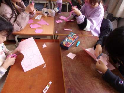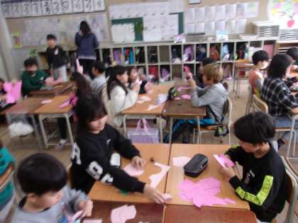 3月13日 新入生の入学式でかざるために画用紙を桜の花の形に切りました。