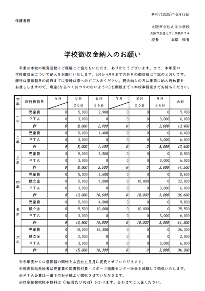 ホームページ左の配布文書(事務室より)のところに、学校徴収金納入のお願い(年間納入予定額)の文書を掲載いたしましたので、ご覧おきください。