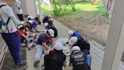 焼いた木の板をタワシで磨いて、ぞうきんでふきとると、ツヤが出ます。