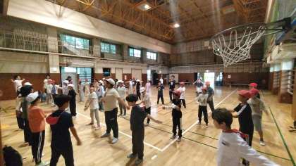 直前に雨が降り、朝のつどいは体育館で行いました。