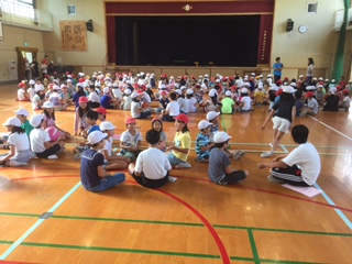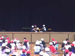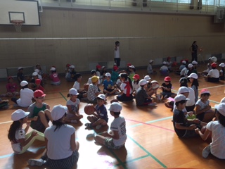 今日は、ばくだんゲームです。音楽が止まるまでボールを回します。