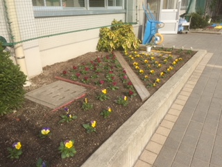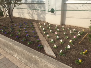 管理作業員の方が、花壇をきれいにしました。パンジーの苗を植え付けました!