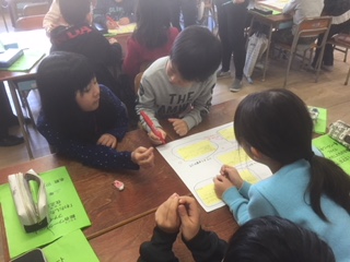子どもたちは、今まで学習したことをもとにグループで話し合いました。