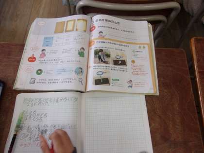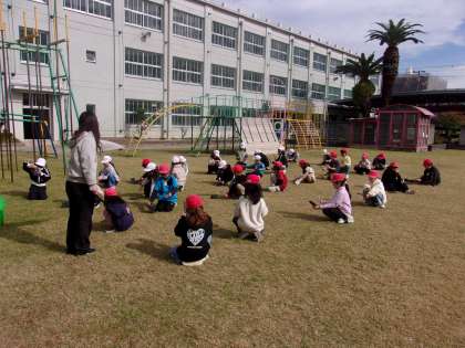 教室での実験方法を確認した後、運動場で実際にやってみました。